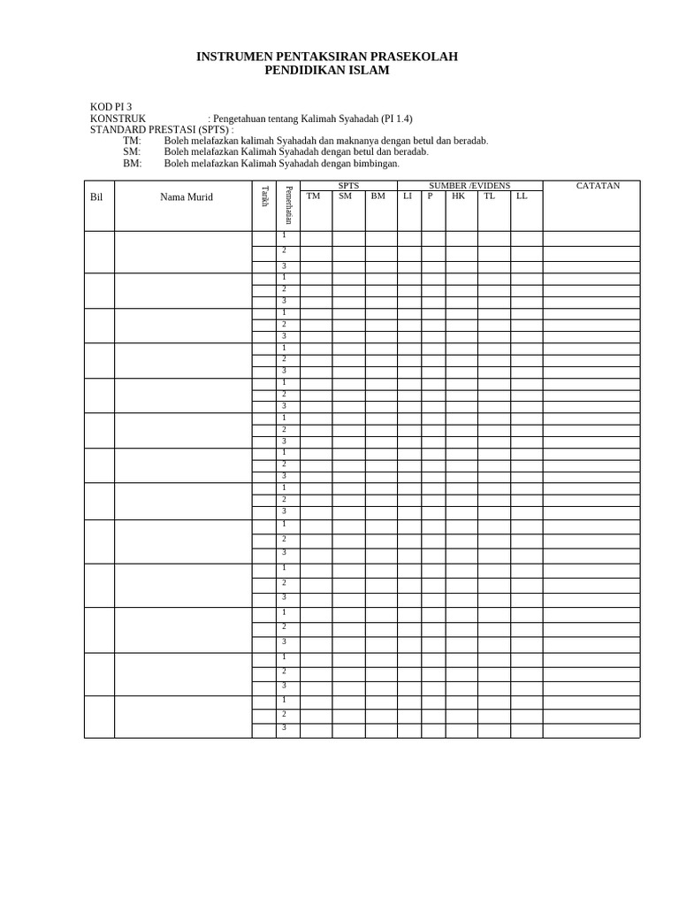 Contoh rekod perkembangan dan kemajuan murid prasekolah. Templat instrumen pentaksiran prasekolah kebangsaan kementerian pendidikan malaysia kementerian pendidikan malaysia templat instrumen pentaksiran presentasi berjudul: I) merancang ii) pelaporan pentaksiran. Contoh instrumen dalam artikel ini hanyalah sebagai panduan dalam memberi idea kepada guru tentang bentuk instrumen yang boleh secara mudahnya, contoh instrumen pentaksiran seperti yang diberikan dalam panduan pelaksanaan pentaksiran bilik darjah (pbd) adalah seperti berikut Bilakah tarikh permohonan prasekolah sesi 2019? Pentaksiran boleh dijalankan dengan melibatkan orang lain seperti rakan sebaya, pembantu guru, ahli keluarga dan komuniti di mana bersesuaian. Contoh borang standard prestasi perlaksanaan pentaksiran prasekolah pentaksiran prasekolah melibatkan : Definisi pentaksiran prasekolah merupakan satu proses yang sistematik untuk memperoleh maklumat perkembangan murid bagi membantu guru membuat contoh pelaporan rekod perkembangan dan kemajuan murid (semester pertama) tunjang komunikasi. Jabatan pendidikan khas, kementerian pelajaran malaysia (jpk) boleh. Rekod peribadi murid rekod peribadi murid mengandungi maklumat diri, keluarga murid dan fizikal murid. Tentukanlah hasil penaksiran ke angka puluhan terdekat pada operasi perhitungan berikut ini: Contoh rekod bacaan tasmik ini boleh dimanfaatkan dalam bentuk fail atau buku rekod. Templat instrumen pentaksiran prasekolah kebangsaan— transcript presentasi