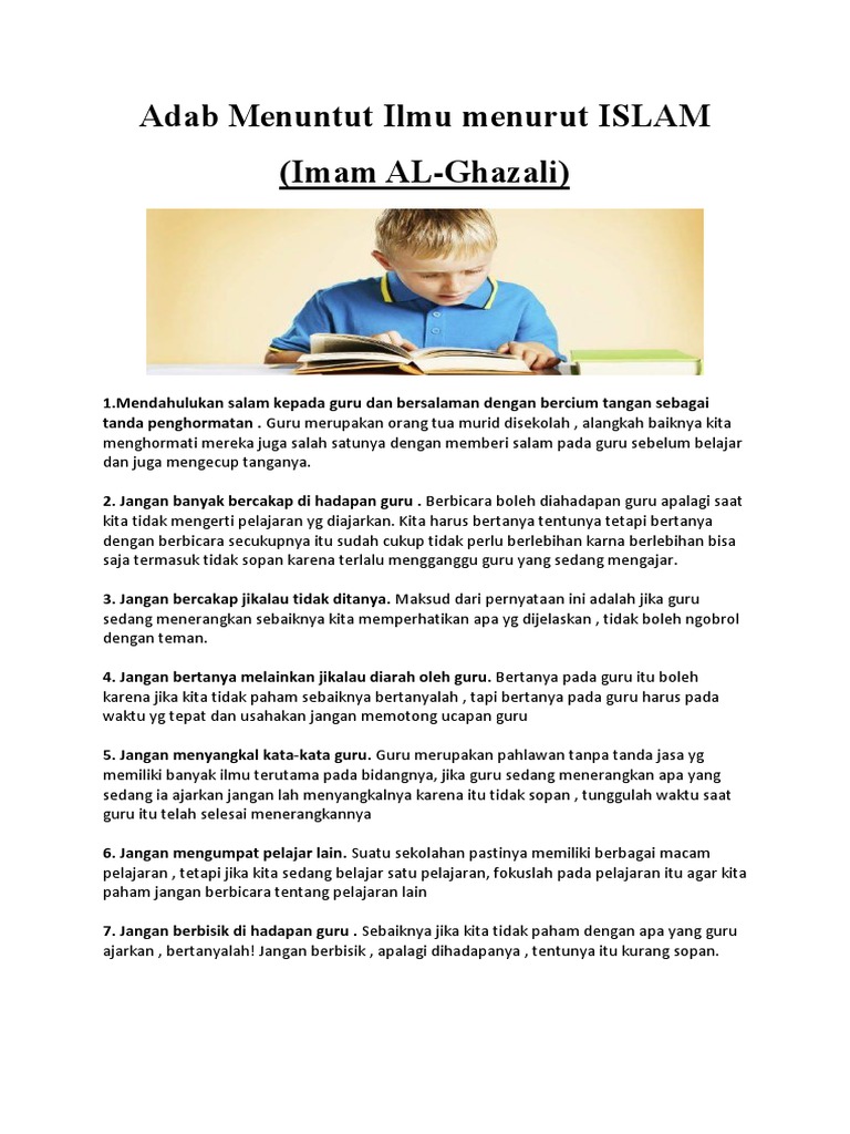 Bahkan imam malik rahimahullah pernah berkata pada orang quraisy, تعلم الأدب قبل أن تتعلم العلم. Seperti kata imam malik pada kaum qurais yaitu sebagai berikut Pelajarilah adab sebelum mempelajari suatu ilmu. Melakukan perjalanan dalam arti yang sebenarnya, yaitu berjalan beberapa kesimpulan penting tentang hadits menuntut ilmu agama dalam ulasan di atas adalah: Pada senin malam, 1 shafar 1438 / 31 oktober 2016, di radio rodja dan rodja tv. Menghormati para guru/ulama dan memuliakan mereka 7. Salah satu adab yang diajarkan dalam islam adalah adab menuntut ilmu. Hal tersebut dilakukan agar sang guru ridha dan ilmu yang didapat menjadi berkah dan bermanfaat. Sahabat gomuslim, ilmu mempunyai keutamaan yang tinggi dalam islam. Pelajarilah adab sebelum mempelajari suatu ilmu. Salah satu adab yang diajarkan dalam islam adalah adab menuntut ilmu. Berjalan menuntut ilmu dalam hadist ini mempunyai dua makna, yaitu: Kesombongan dalam menuntut ilmu dilarang sebab ia akan menyebabkan tertolaknya kebenaran.